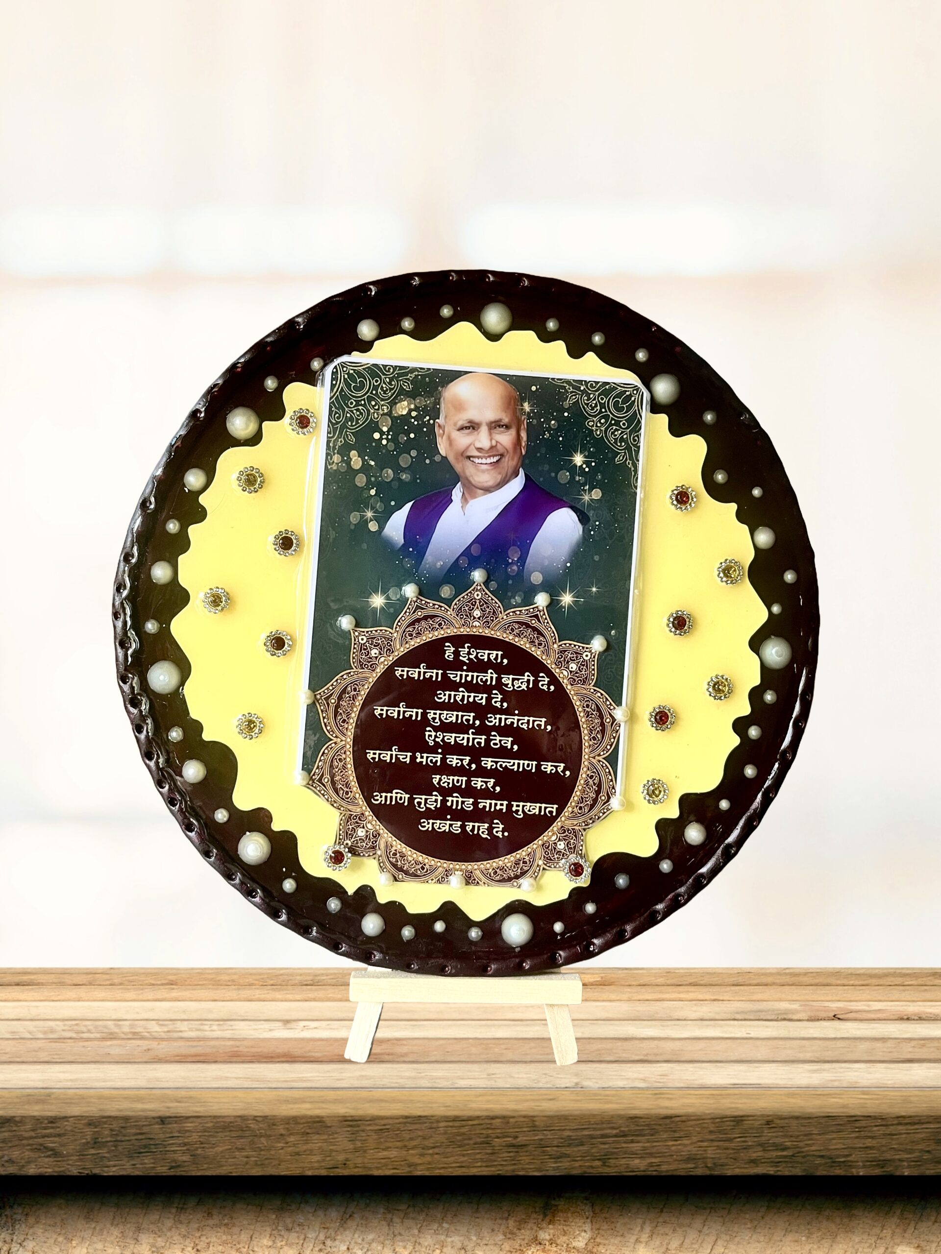 Add a touch of elegance and devotion to your space with this beautifully handcrafted Customized Resin Art Photo Plaque. Designed with high-quality resin, decorative pearls, and traditional motifs, this premium showpiece highlights a personalized photo along with a heartfelt Marathi blessing.