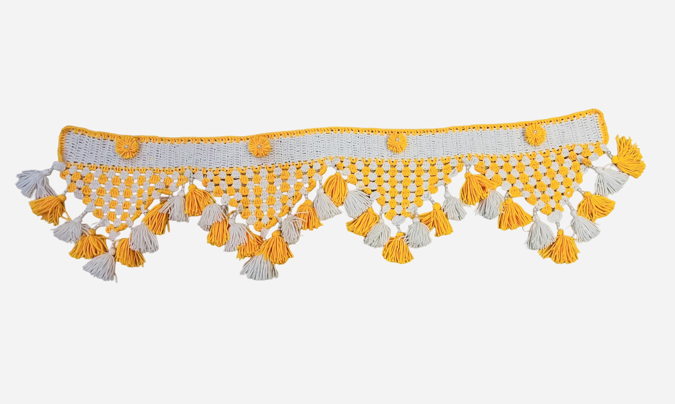 Add a touch of tradition and elegance to your home with this beautifully handcrafted crochet toran. Designed in a soothing white base with vibrant yellow tassels, this door hanging enhances the beauty of your entrance instantly.